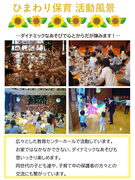 親子一緒に参加し、同年齢の友達と触れ合いながら楽しい時間を過ごします。