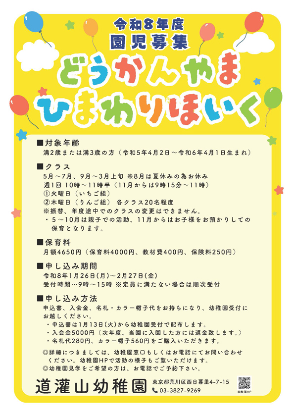 園児募集の詳細につきましては、ポスター、チラシをご覧ください。また、幼稚園HPにて活動風景を掲載しています。そちらもぜひご覧ください。