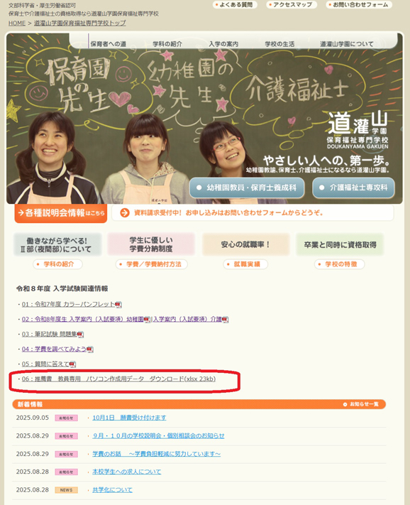 専門学校HPトップページ「・06:推薦書 教員専用 パソコン作成用データ ダウンロード(xlsx 23kb)」もしくは下記アドレスよりダウンロードが可能です。ご活用いただければ幸いです。